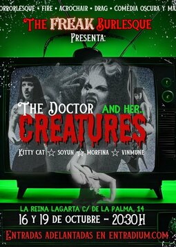 ¡La doctora y sus Criaturas! Una científica desquiciada se puso a experimentar.. y de sus pruebas salieron los seres más aterradores y sensuales del inframundo. Prepárate para esta edición llena de TERROR Y SANGRE, con espectáculos de fuego, baile, drag, acrochair, horrorlesque y mucho más de la mano de nuestras increíbles artistas